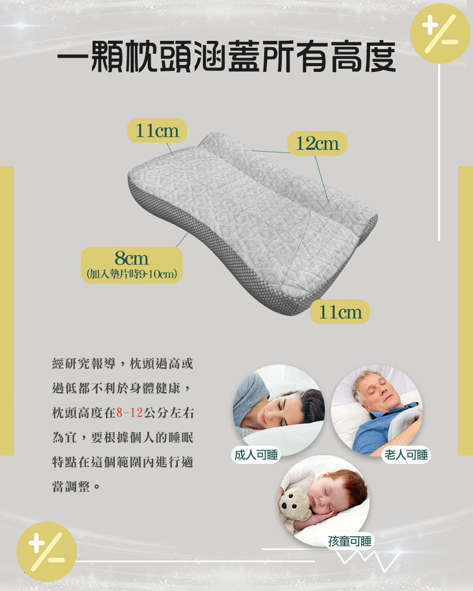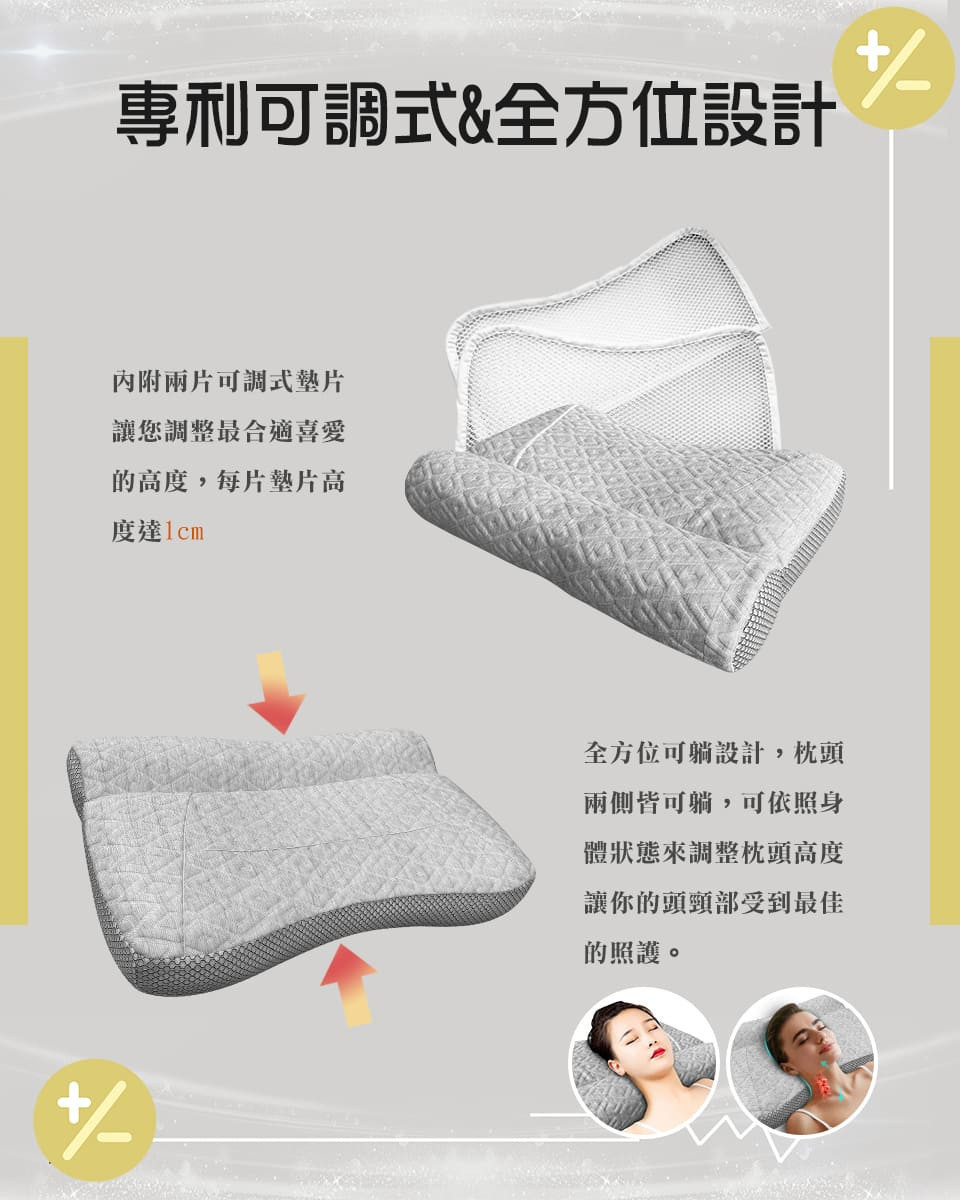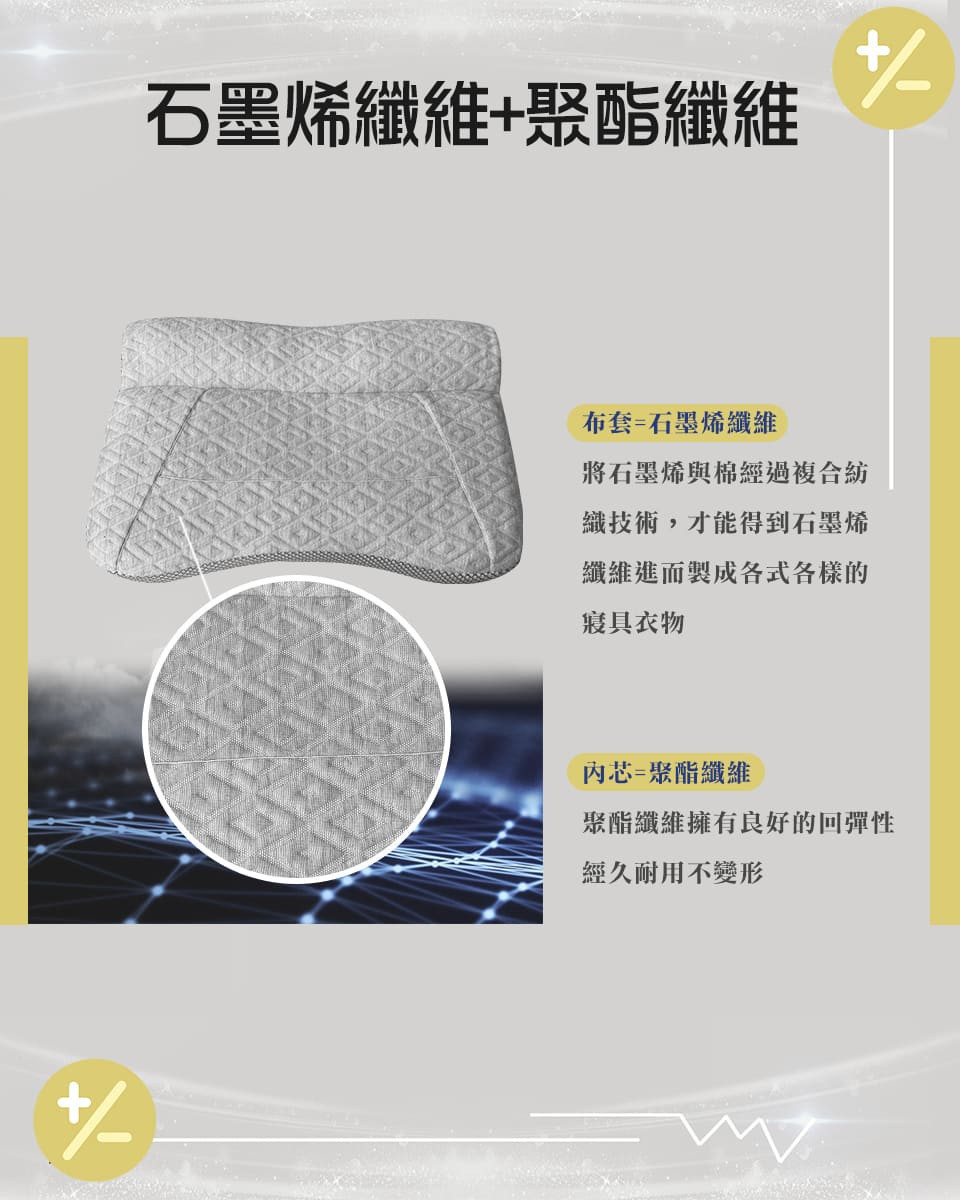 2.石墨烯可釋放遠紅外線,幫助循環。 3.CIX專利編織,回彈釋壓不變形。 4.可水洗,髒污不殘留,使用更安心。 5.可調式設計,依照個人喜好調整,一枕多變,使用不受限。